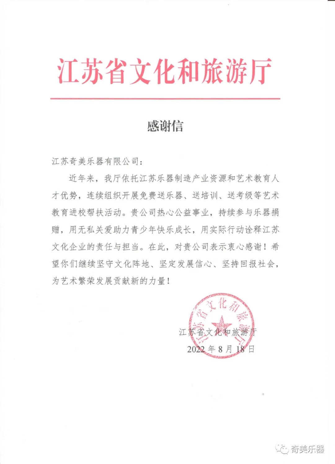 近日,奇美公司收到了來自江蘇省文化和旅游廳的感謝信,感謝奇美公司長期以來對藝術教育扶貧工作的關心和支持。